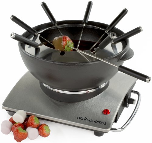 Andrew James 1.2 litre Cast Iron Electric Fondue : Suitable for up to 8 peopleOur latest model, now boasts a generous 1.2 litre capacity cast iron bowl and is suitable for all types of fondues, including oil, stock, chocolate and cheese.This fondue is suitable for fondue bourguignonne, Chinese fondue, Vegetable Tempura , traditional Swiss cheese fondues and chocolate dessert fonduesThe fondue has a sperate hotplate which can be used on its own if required.In the party moodWhether its an intimate occasion for 2 or a fun gathering with friends, the Electric Fondue will always strike the right note.Perfect fondues cooked at the table on the hotplate.With a large capacity, cast iron bowl and 8 matching fondue forks, this is an ideal product for table top entertaining.Suitable for all types of fondues. *Contemporary design for a traditional product*Black cast iron fondue bowl**Cook at the table*8 reversible length stainless steel fondue forks*Stainless steel separator ring*Cast iron heating plate.**Extra long power cable (2 metres)*Variable thermostat.*230V~50Hz 1000WPlease Note: Food Not Included Read more details..