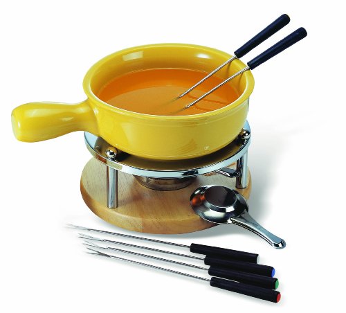 Cheese fondue set with yellow ceramic fondue potServes 6 people with 6 fondue forks includedWooden tray with burner includedCeramic pot is easy to clean and dishwasher safeSuper fondue set from Beka