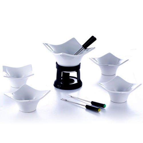 4 x Fondue Forks with plastic handles - 4 x Fruit bowls (ceramic) Dimensions: approx. 10 x 10 x 6 cm (LxWxH) - 1 x Chocolate bowl (ceramic) Dimensions: approx. 12.5 x 12.5 x 9 (LxWxH) - Height including stand: approx. 14 cm - 1 x metal stand black with candle holder - Dishwasher safe - New & sealed Read more details..