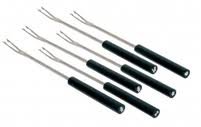 Boxed set of 6 Swiss meat fondue forks - 2 prongs/teeth, in satin chrome with black handles. Read more details..