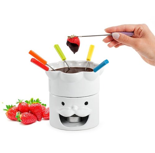 Ceramic Cartoon Happy Chef Design, tea light burner and 6 metal fondue forks. Suitable for meat, cheese and chocolate fondues. Read more details..