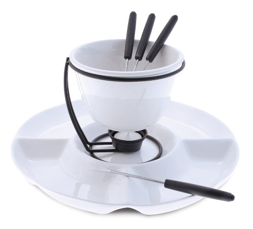A nice complete chocolate fondue set from Swissmar.You can chocolate fondue with four persons.Specifications:Contents fondue: 650ml/22ozPorcelain dish and fondueBlack metal frame with candle holder4 stainless steel fondue forksThe Porcelain fondue pot and bowl are dishwasher, microwave and oven safe. Read more details..