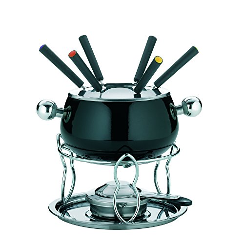 66386 Fondue set consists of: -1x 16 cm fondue pot. - 1x splash protection lid. - 1x rechaud heating frame. - 1x 20 cm bottom plate. - 6x fondue forks. - 1x burner paste. Fondue set features: - Colour (fondue pot): black. - Fondue pot in enamelled completion. - Rechaud heating frame and bottom plate in chromed completion. Fondue set product details: - Material (splash protection lid): 18/8 stainless steel. - Material (rechaud frame and bottom plate): metal. - Material (forks): stainless steel. - Material (handles): plastic. - Dimensions: 20.5-21.5 x 20.5-21.5 x 20.5-21.5 cm. Read more details..