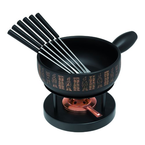 Black glazed pot with copper decor makes every Fondue Party a holiday feast. The copper burner was matched to the decor. With the high-quality pot you get the appropriate burner, a burner filled with fuel and 6 forks. Easy to use. Details: , The pot is suitable for the dishwasher but it is advised to clean it by hand. , Fill your pot after use with cold water and let it rest for a couple of hours, this way the remnants of cheese will be easy to remove. , Clean the pot afterwards with a brush and cleaning liquid. Set contains: 1 Caquelon, Ø 23 cm, 2,6 L, clay, black 1 Schafing dish, stainless steel 1 Paste burner (filled with burner paste), stainless steel 6 forks Kuhn Rikon article number: 32055 , Pack contains:1 Kuhn Rikon Caquelon, Ø 23 cm, 2,6 L, Clay, Black 1 Kuhn Rikon Chafing Dish, Stainless Steel 1 Kuhn Rikon Burner (filled with Fuel), Stainless Steel 6 Kuhn Rikon Forks Read more details..