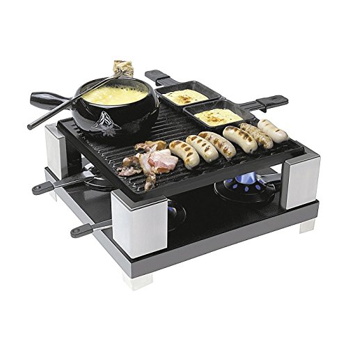 The ideal mix between cheese fondue, gourmetting and racletting! Characteristics: A beautiful 36 parts Swiss gourmet set Gourmet set supplied with 4 spirit/burning sel burners 3 fondue pans, 13 cm in diameter If no parts are placed on the plate the hot plate is also suitable to make French pancakes. 1 spatula to turn crepes (pancakes) 8 cheese fondue forks 8 raclette pans with 8 raclette spatulas All parts are easy to remove for cleaning Read more details..